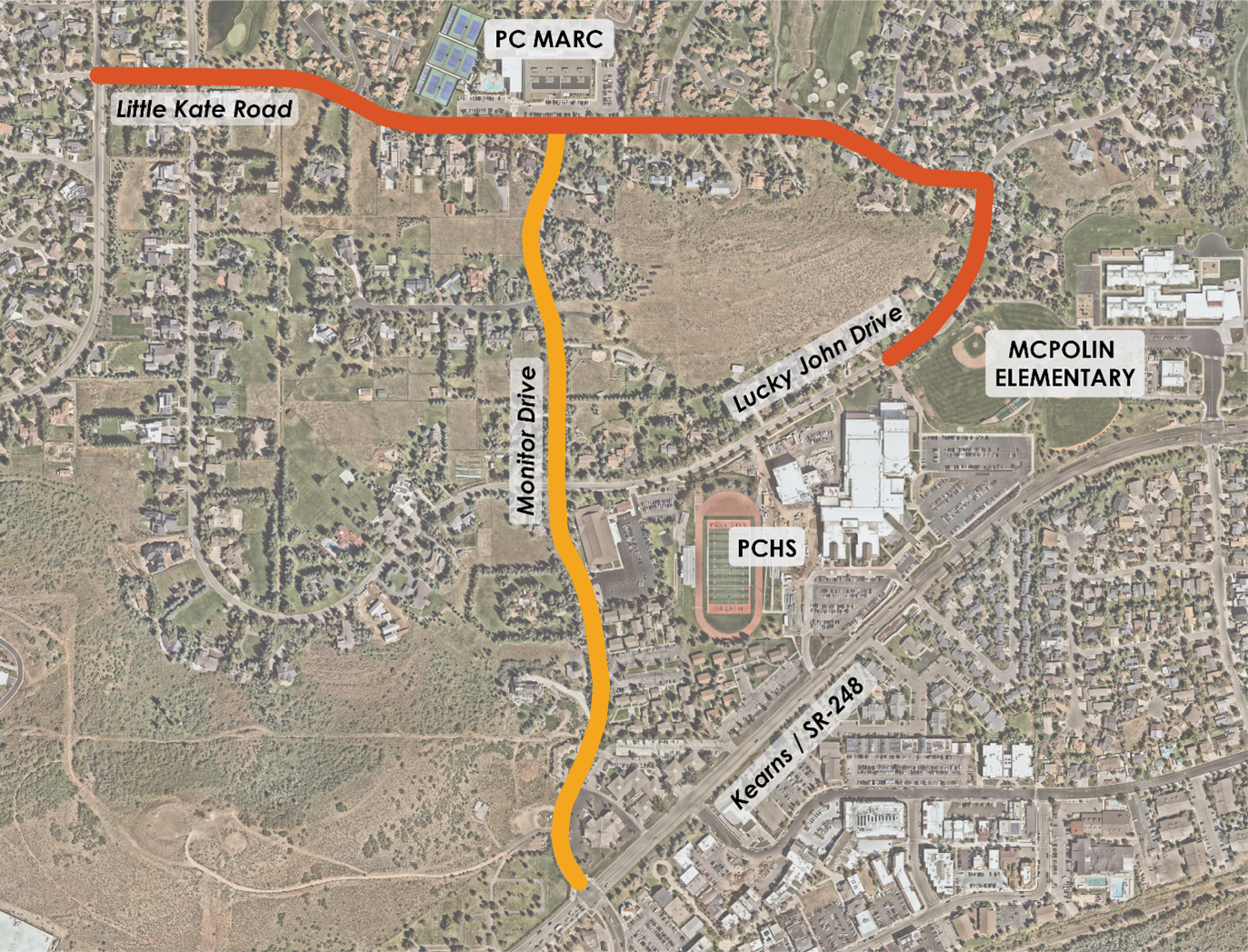 These enhancements will begin at the Monitor Drive and Kearns Boulevard (SR-248) intersection and end at the intersection with Little Kate, adjacent to the PC MARC intersections. Crossings along these segments of roadway will be enhanced to improve pedestrian visibility and slow vehicle traffic.